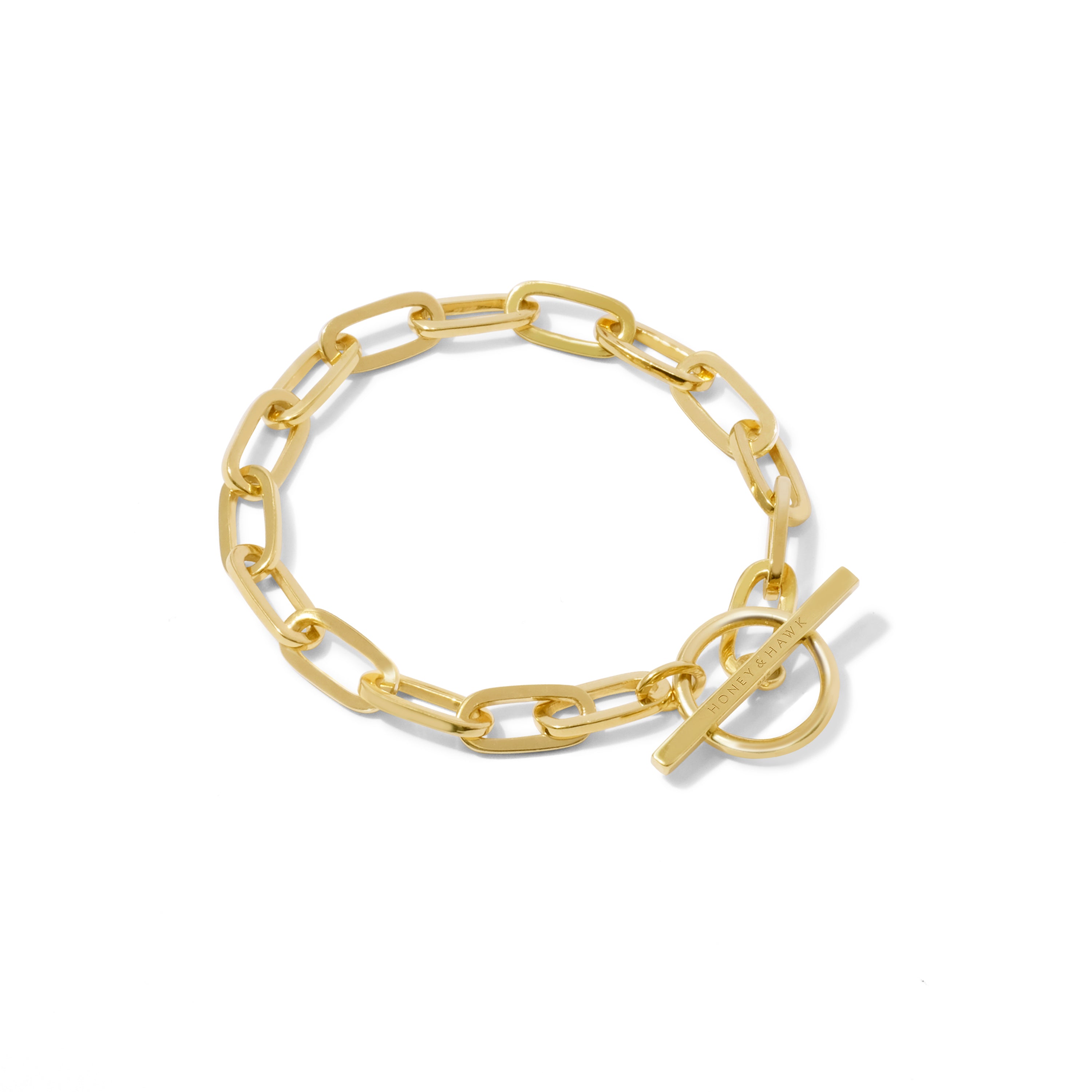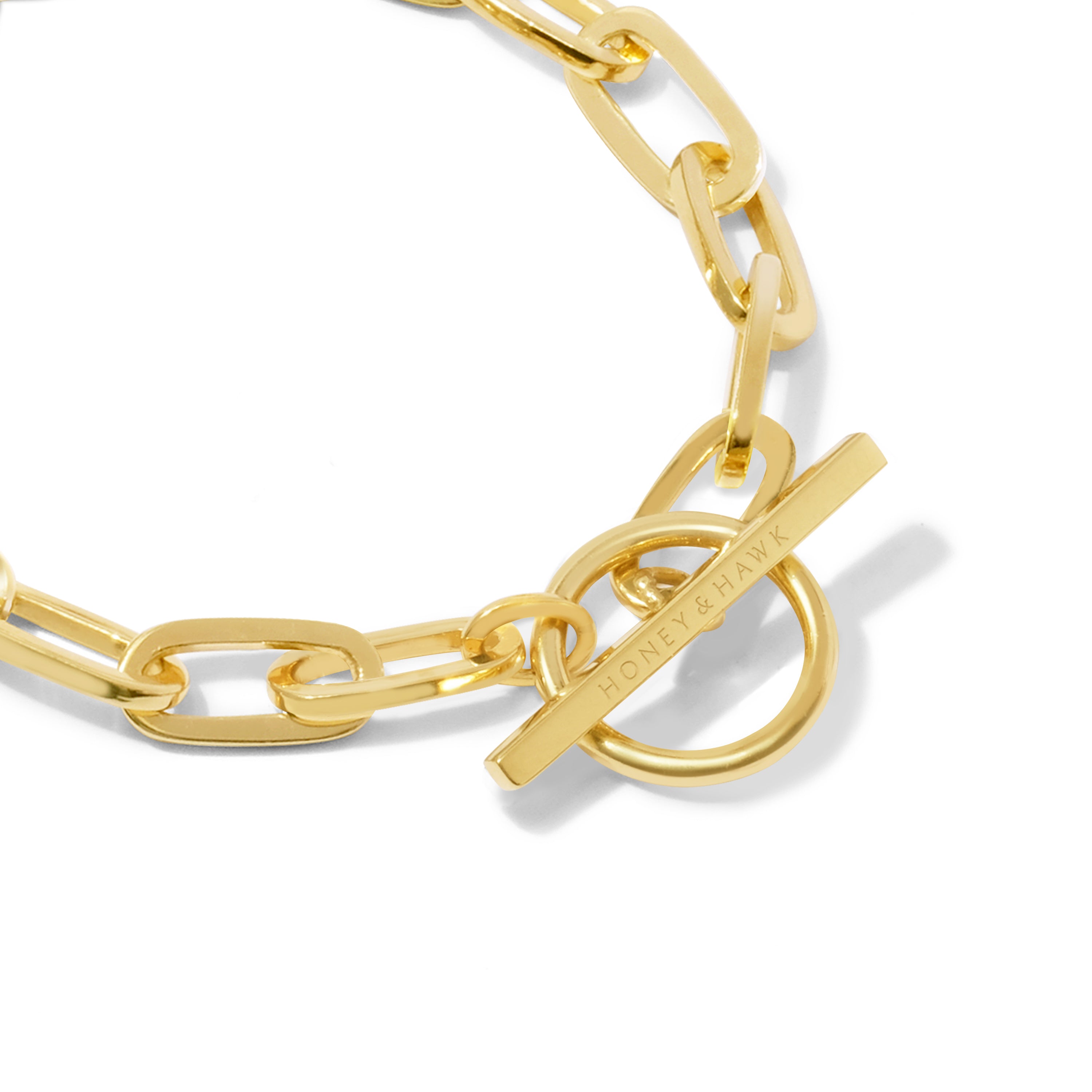 A timeless signature linked bracelet thoughtfully designed for both him and her. Handmade with our own link design and completed with our Honey & Hawk logo engraved on the T bar.