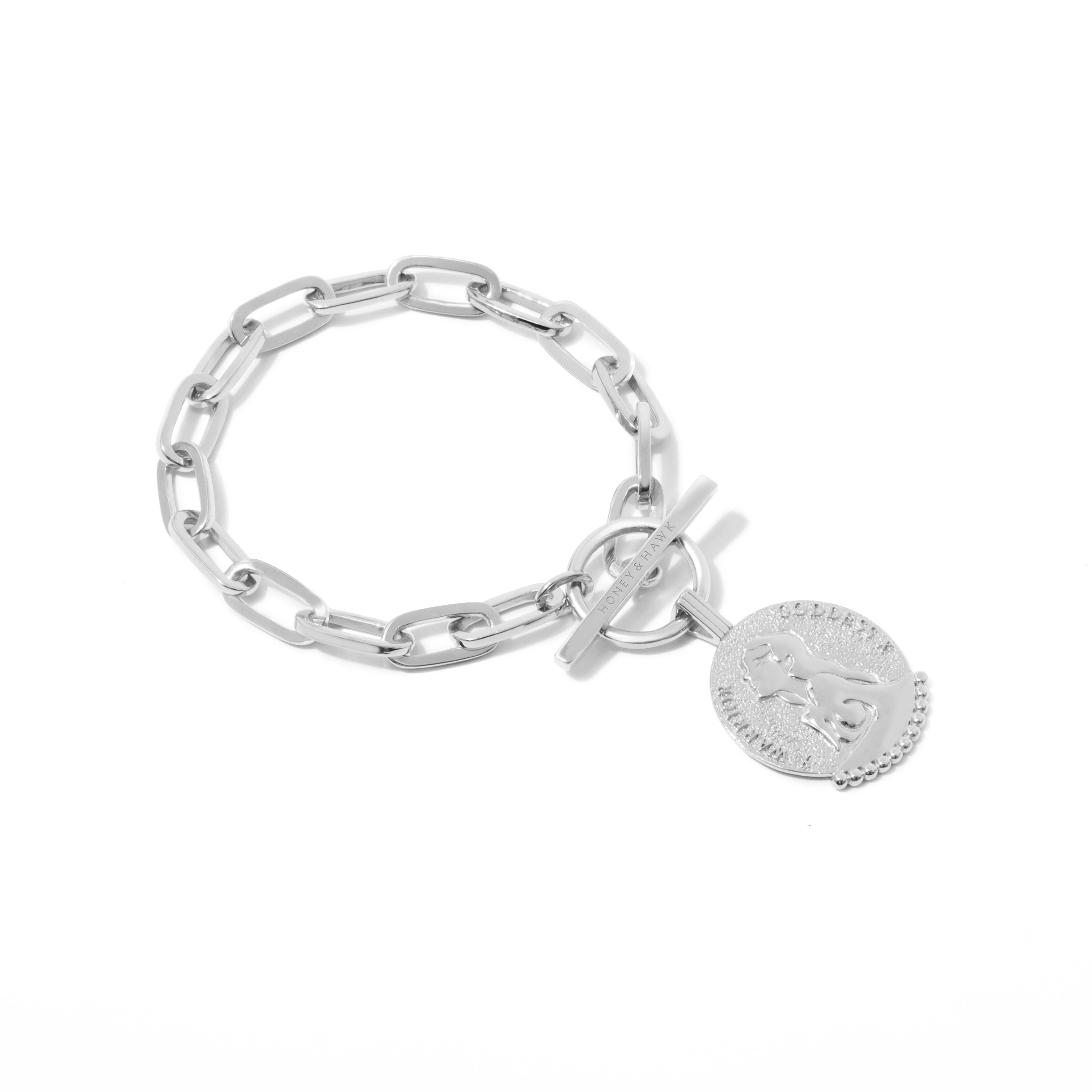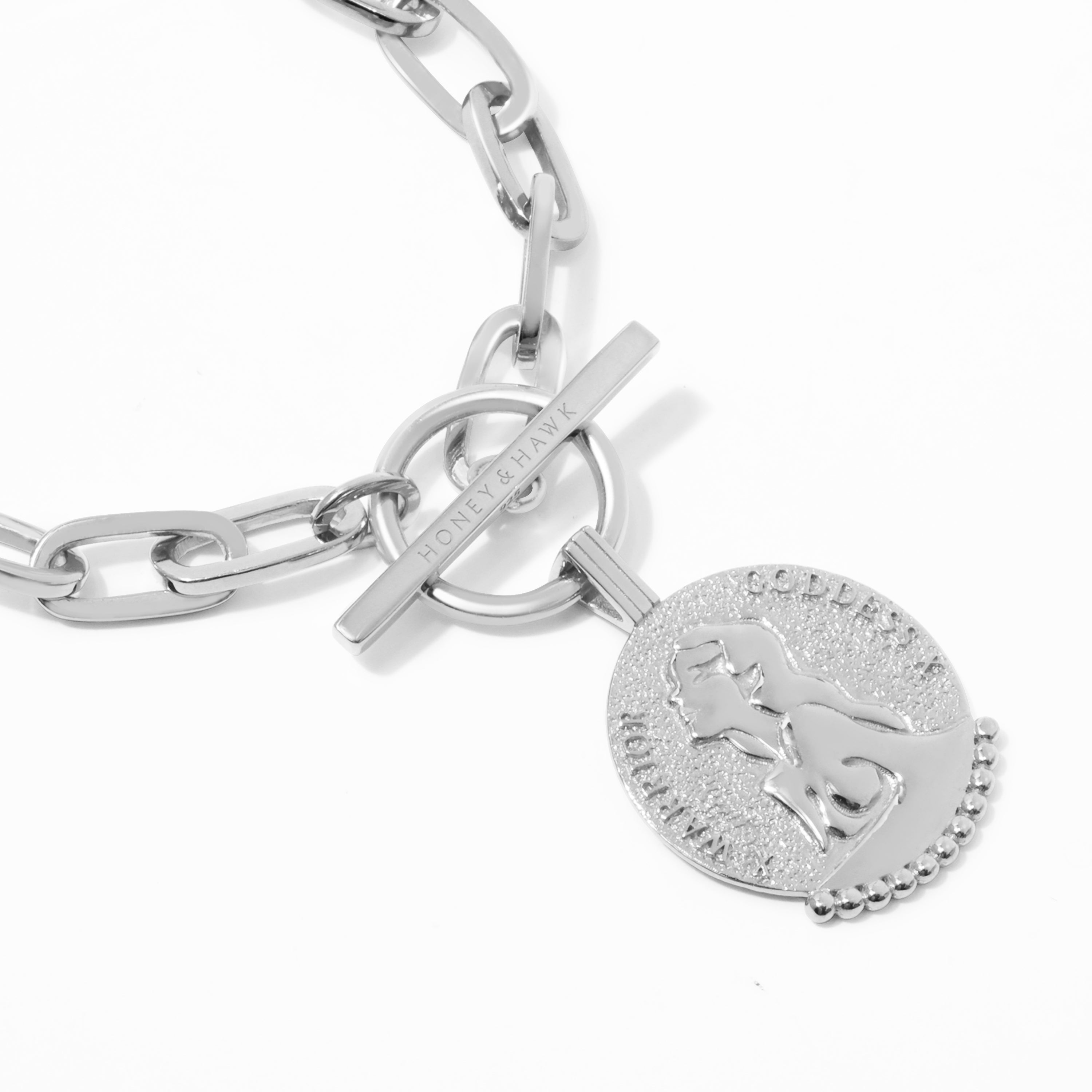 A unique warrior goddess pendant necklace designed to honor and celebrate woman. Our hero collection piece is handmade with our own warrior goddess pendant and custom link design and finished with our Honey & Hawk logo engravement detailing on the T bar. Pair with The Warrior Link Bracelet for empowering feminine strength and energy.